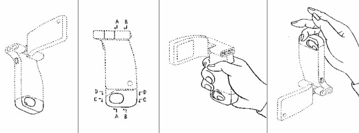 モックの先端部に再現されたハードストラップ(仮称)(指が挿入できる貫通口)部分が、部分意匠として登録され