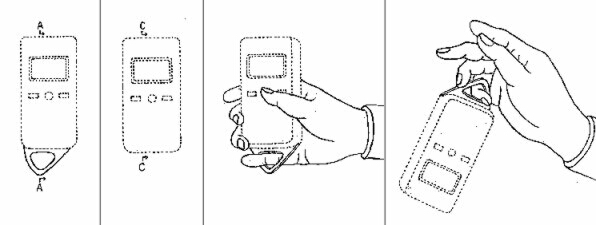 本案(意匠)は、必要に応じて、ハードストラップ(貫通口)に小指、薬指、中指などを挿入して使用します。どの指を挿入す